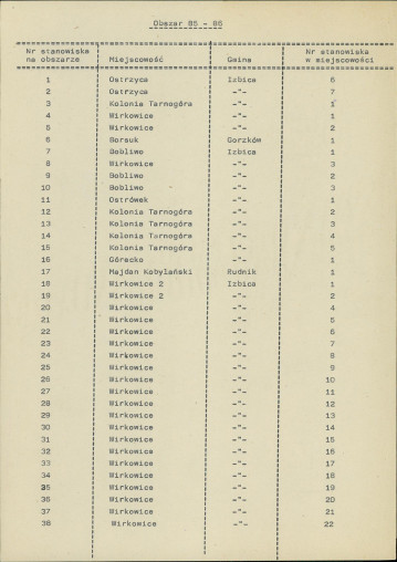 spis stanowisk wg numerów na obszarze