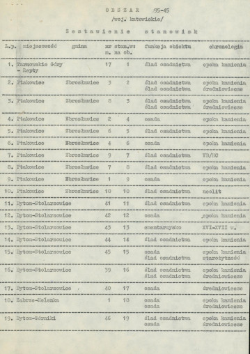 spis stanowisk wg numerów na obszarze