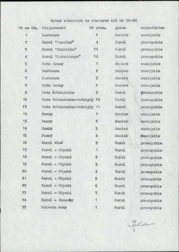 spis stanowisk wg numerów na obszarze