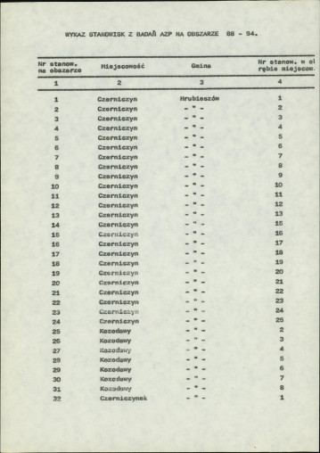 spis stanowisk wg numerów na obszarze