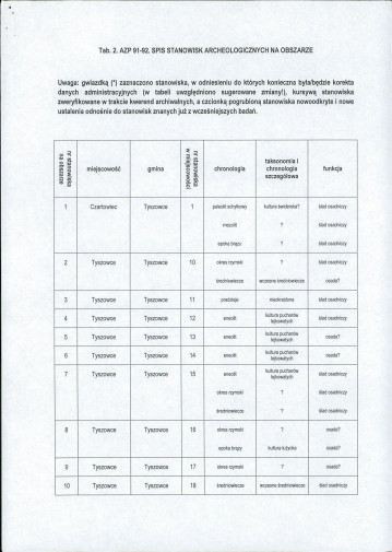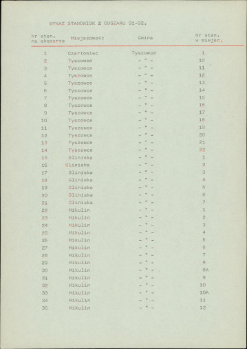 spis stanowisk wg numerów na obszarze