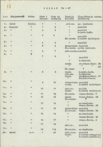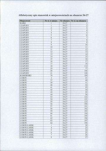 spis stanowisk wg numerów na obszarze