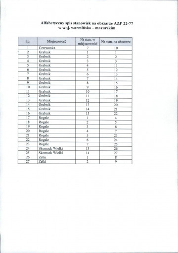 spis stanowisk wg numerów na obszarze