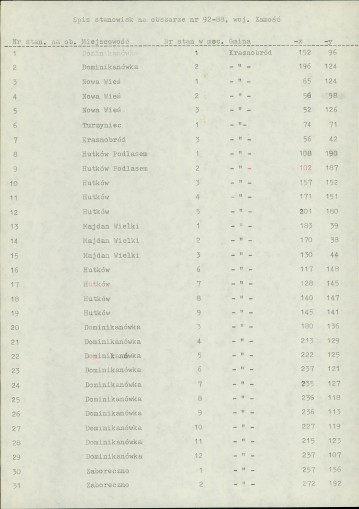 spis stanowisk wg numerów na obszarze